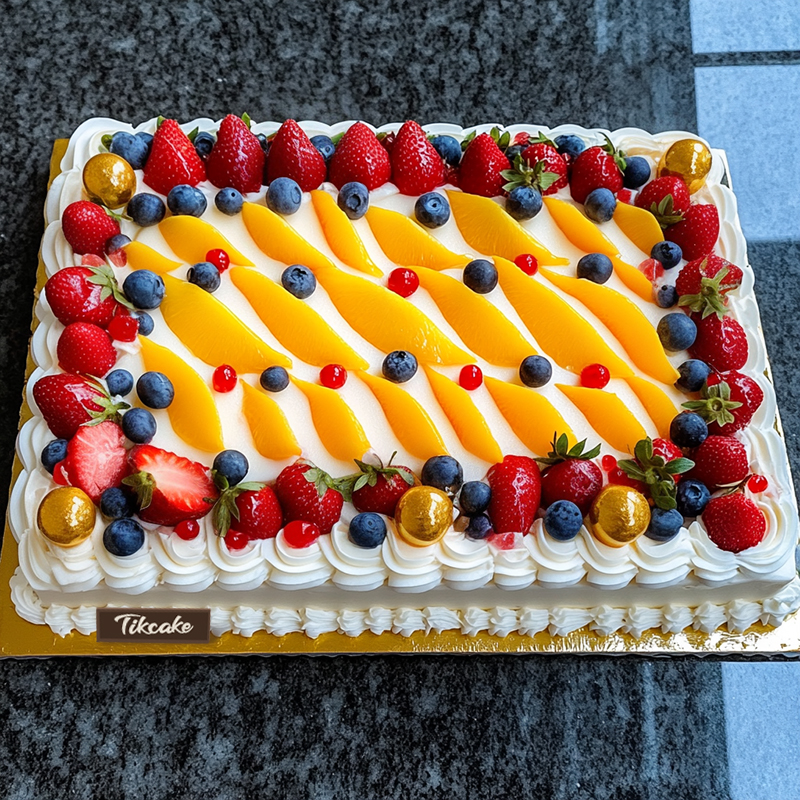 内层蛋糕胚 奶油(含水果果肉)叠加,表层奶油、水果等装饰