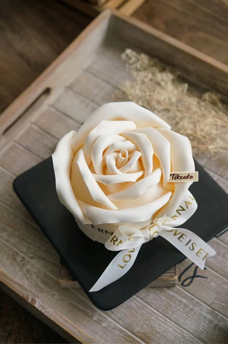 内层蛋糕胚 奶油叠加(含水果果肉),表层玫瑰主题翻糖皮装饰,白色英文缎带束扎点缀