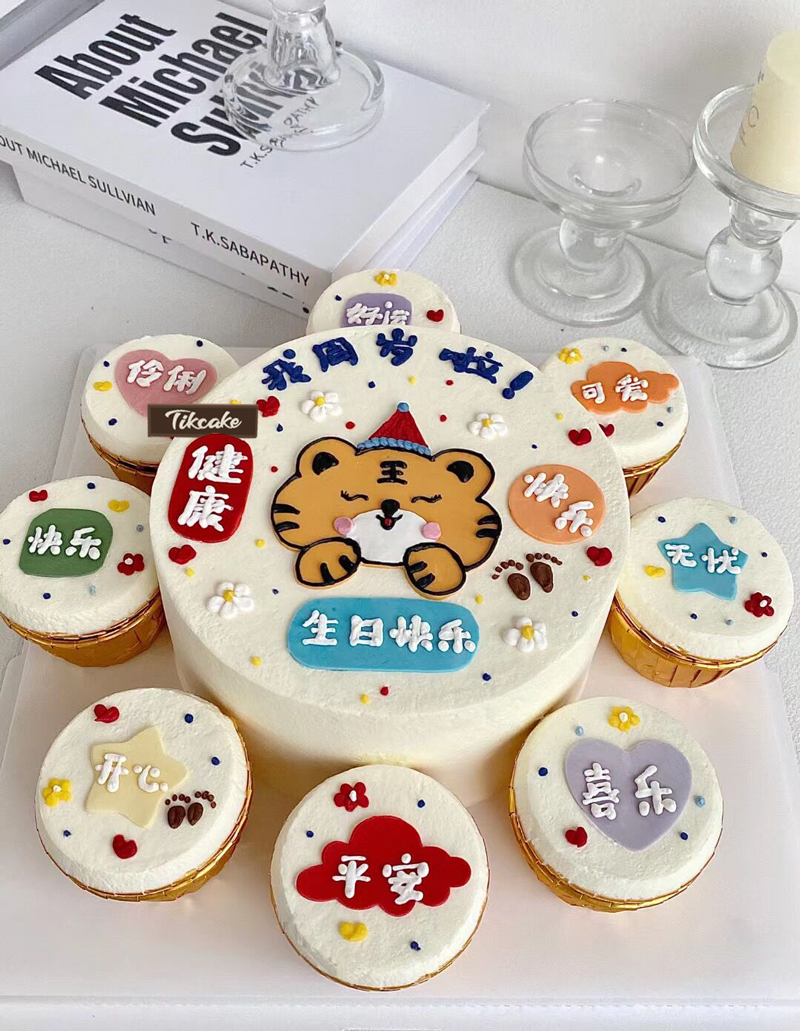 虎宝宝周岁主题手绘鲜奶蛋糕(含8个纸杯蛋糕)-凯发体育买球